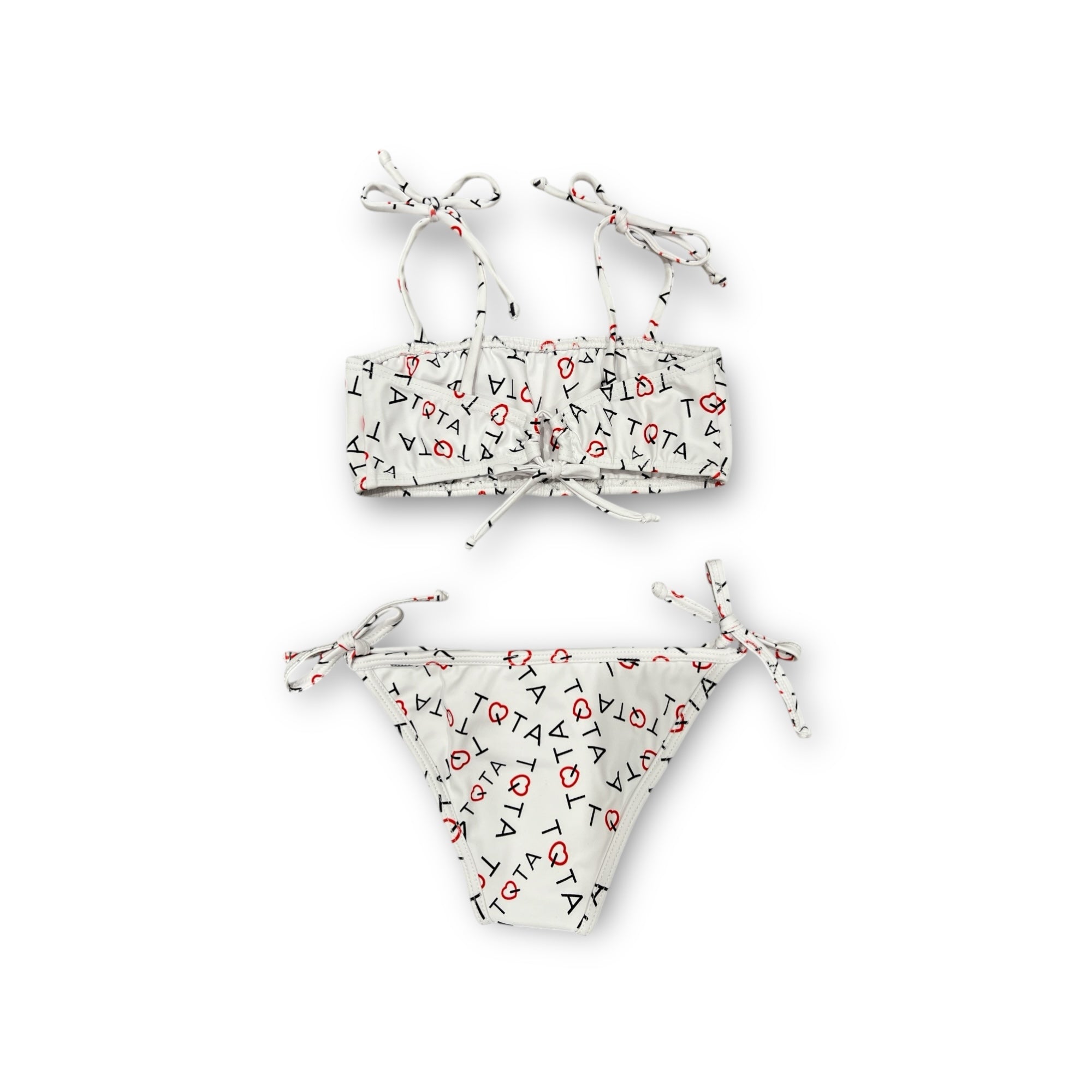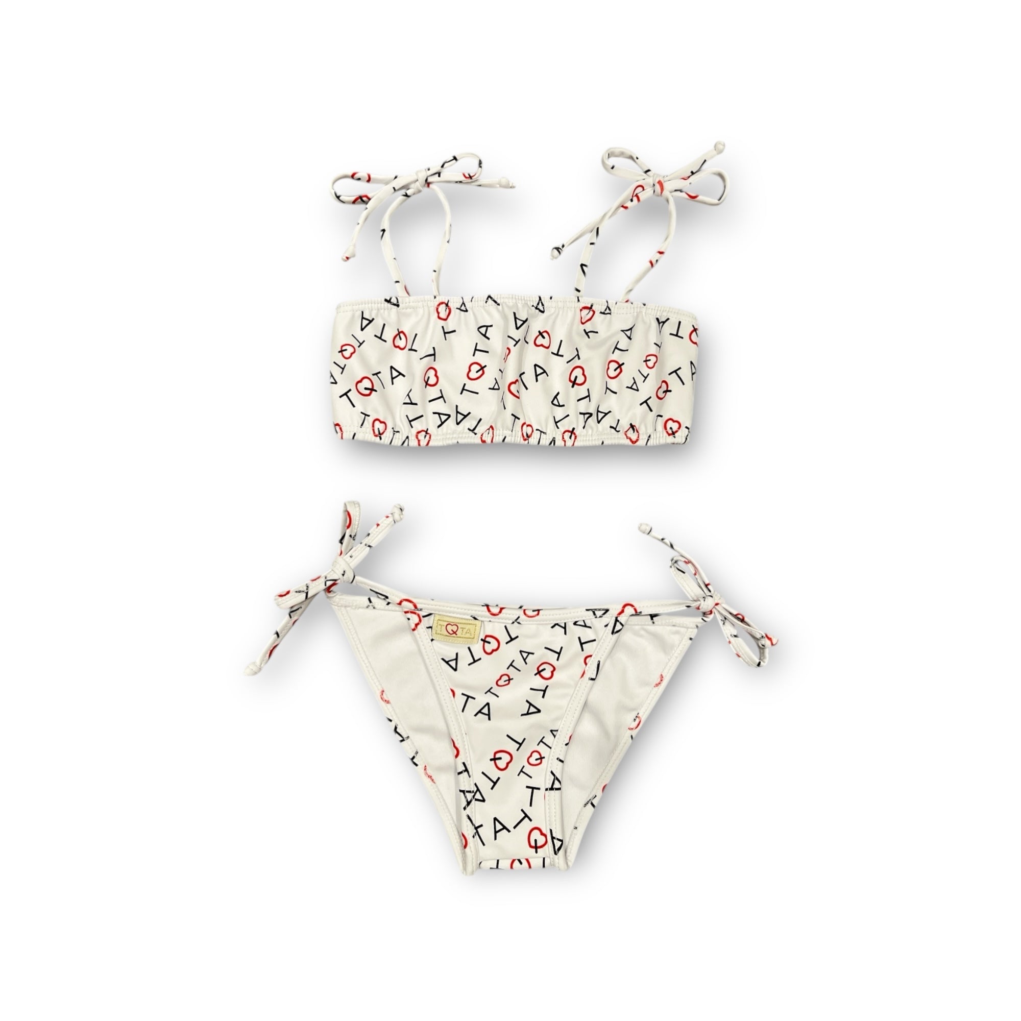 Two piece bikini. Side tie bikini set. Stylish kids swim bikini featuring a playful white design with red accents.